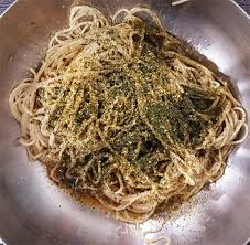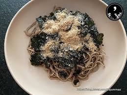 메밀면 200g, 김 1장, 감태 1장, 깨 1큰술, 쪽파 3대, 묵은지 1/8쪽, 설탕 1작은술, 쯔유 7큰술, 들기름 5큰술, 고춧가루 약간
